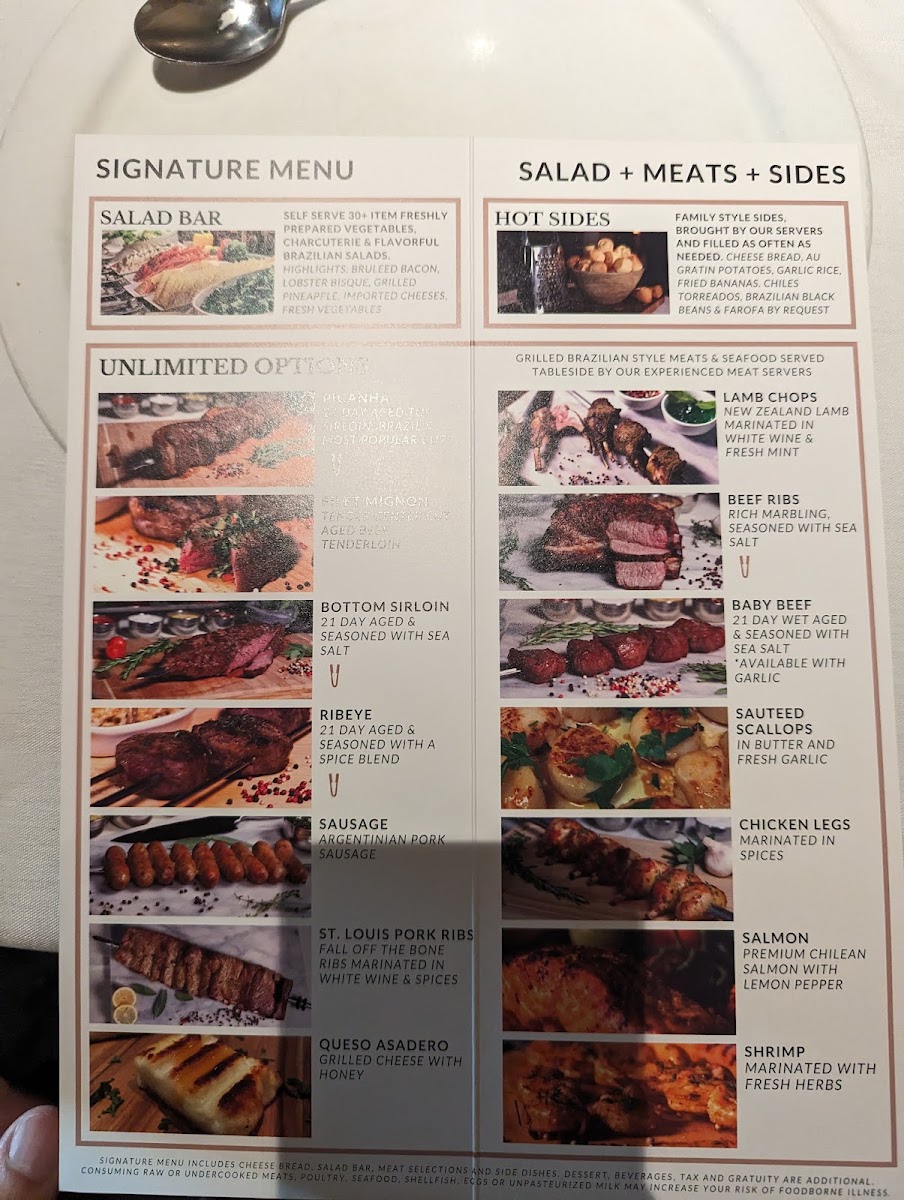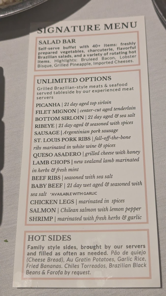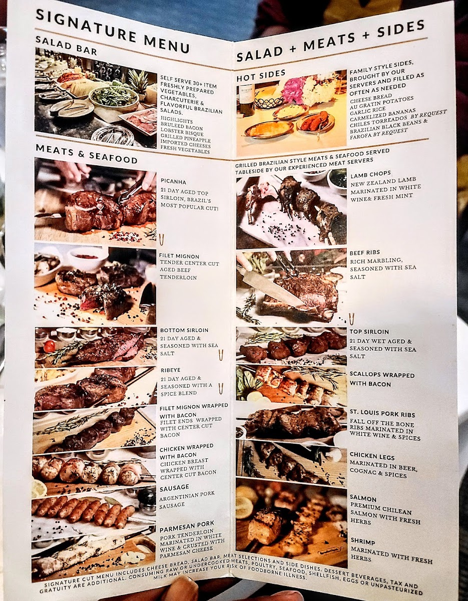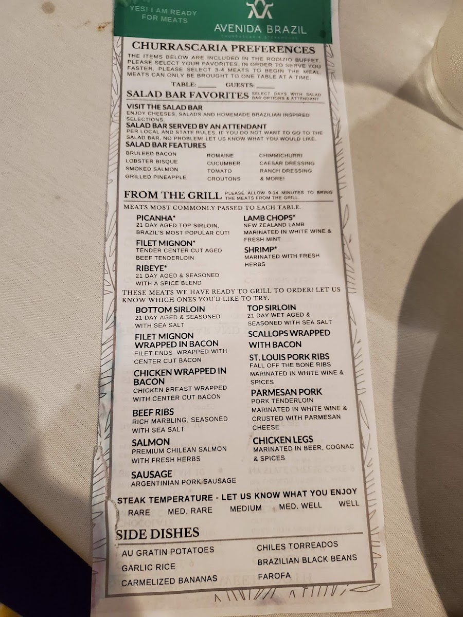 FIRST COURSE: Caesar SaladSECOND COURSE: Grilled Sirloin wrapped in Bacon, Chicken Breast, Chicken Leg, Argentinian Pork SausageHOT SIDES: Choice of 2 Sides + Chimmichurri